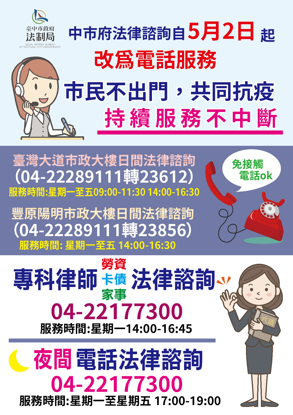 因應新冠肺炎疫情發展,本府臺灣大道市政大樓及陽明大樓法律諮詢服務,自111年5月2日起改電話諮詢聯絡方式:臺灣大道市政大樓日間法律諮詢(04-22289111轉23612)、豐原陽明市政大樓日間法律諮詢(04-22289111轉23856)。歡迎市民多加利用!法律諮詢服務處電話:04-22289111轉23611。