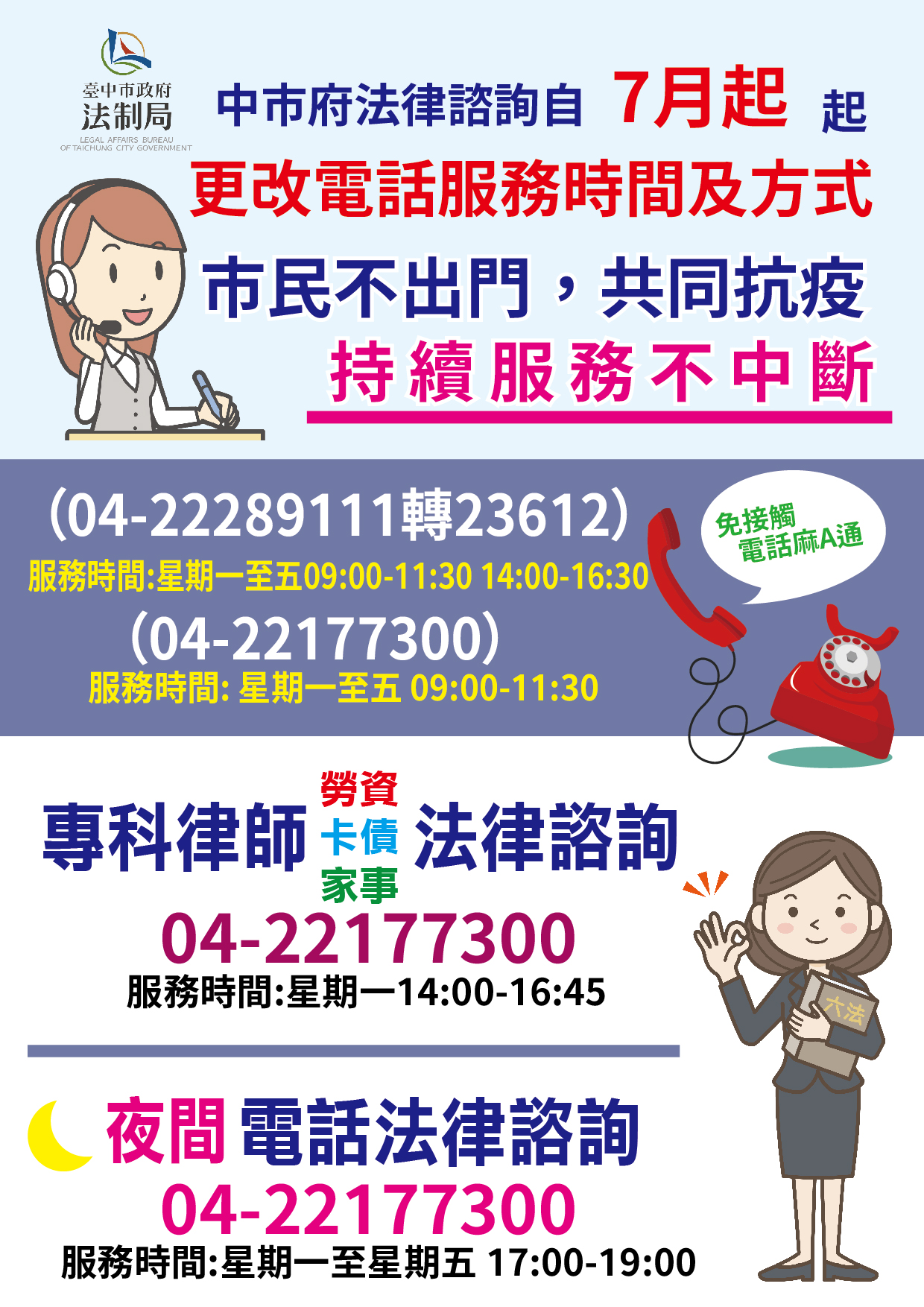 因應新冠肺炎疫情發展,自111年7月起改電話諮詢,聯絡方式:上午9:00~11:30,連絡電話:04-22289111#23612及04-22177300兩線全開;下午2:00~4:30,連絡電話:04-22289111#23612。歡迎市民多加利用!法律諮詢服務處電話:04-22289111轉23611。